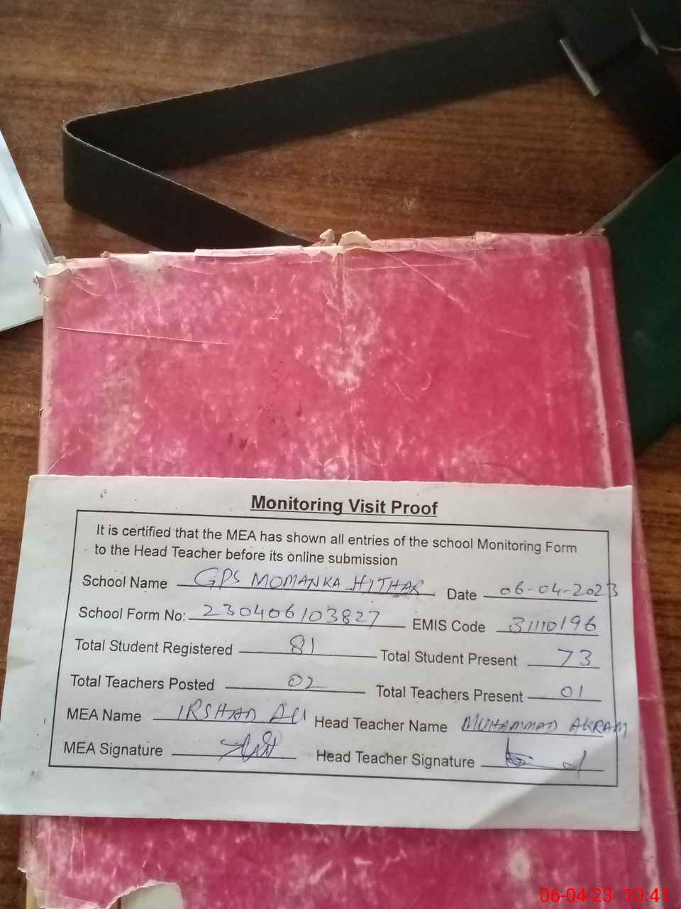 | Attendance Register | Head Teacher | MEA with School | Visit Proof |