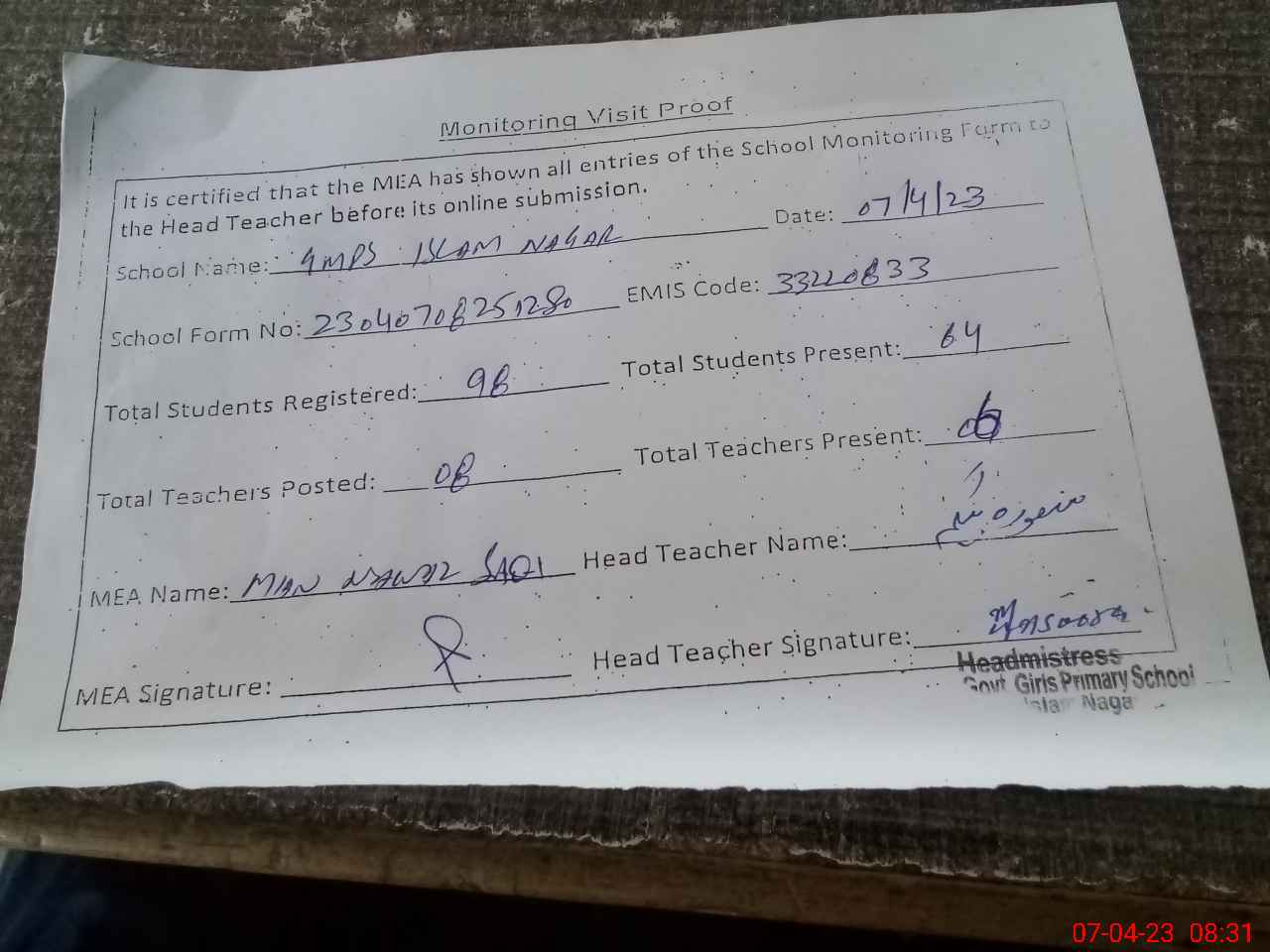 | EMIS Code: 33220833 | Name of School: GMPS ISLAM NAGAR | |||