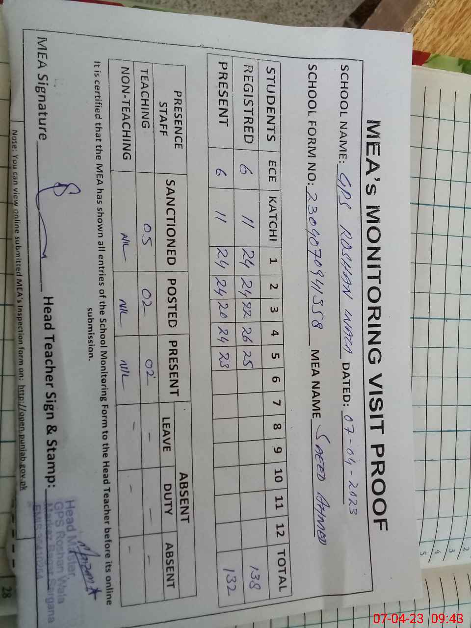 | Attendance Register | Head Teacher | MEA with School | Visit Proof |