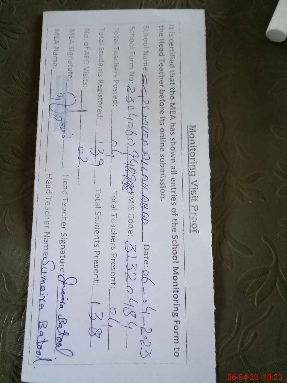 | Attendance Register | Head Teacher | MEA with School | Visit Proof |