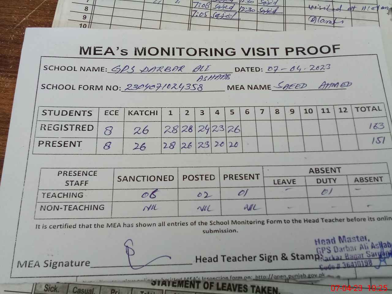 | Attendance Register | Head Teacher | MEA with School | Visit Proof |