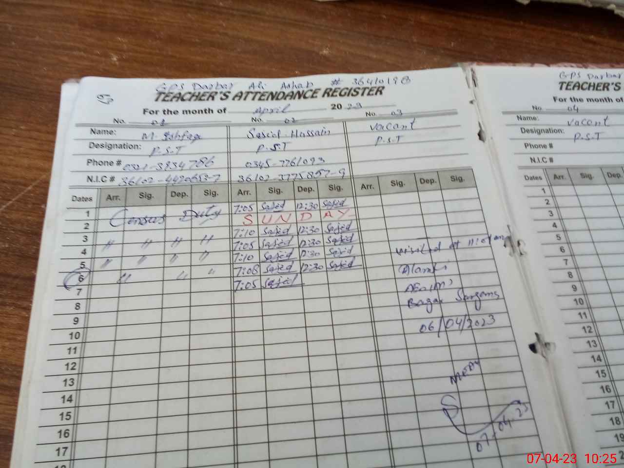 | CNIC | Full Name | Designation | R/C | Absence During Last Calender Month |