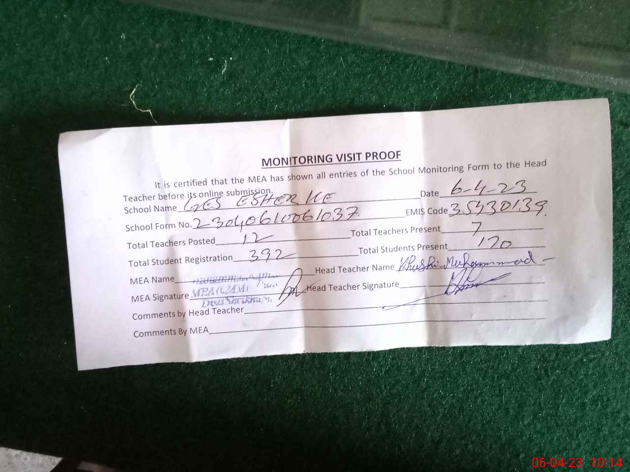 | Attendance Register | Head Teacher | MEA with School | Visit Proof |
