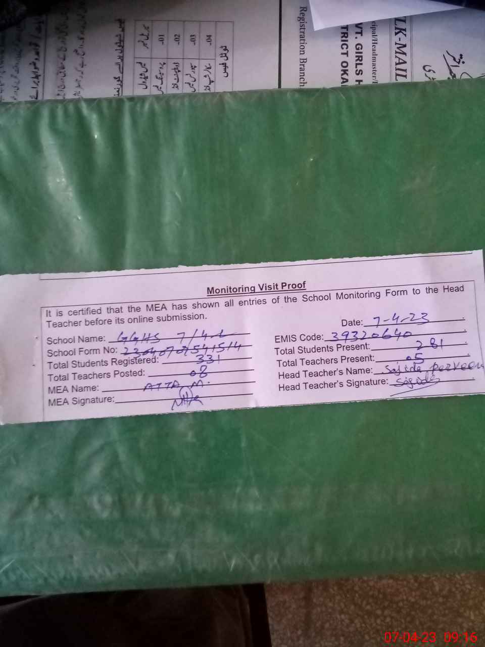 | EMIS Code: 39320640 | Name of School: GGHS CHAK NO. 7/4-L | |||