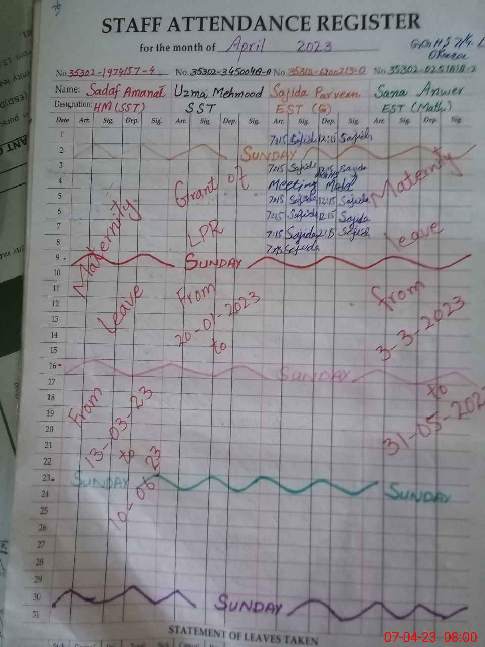 | 35**** | Sa**** An**** | Regular | 29 | 0 | 0 | 29 | 0 | 0 | 0 | 0 | 0 | Maternity | |