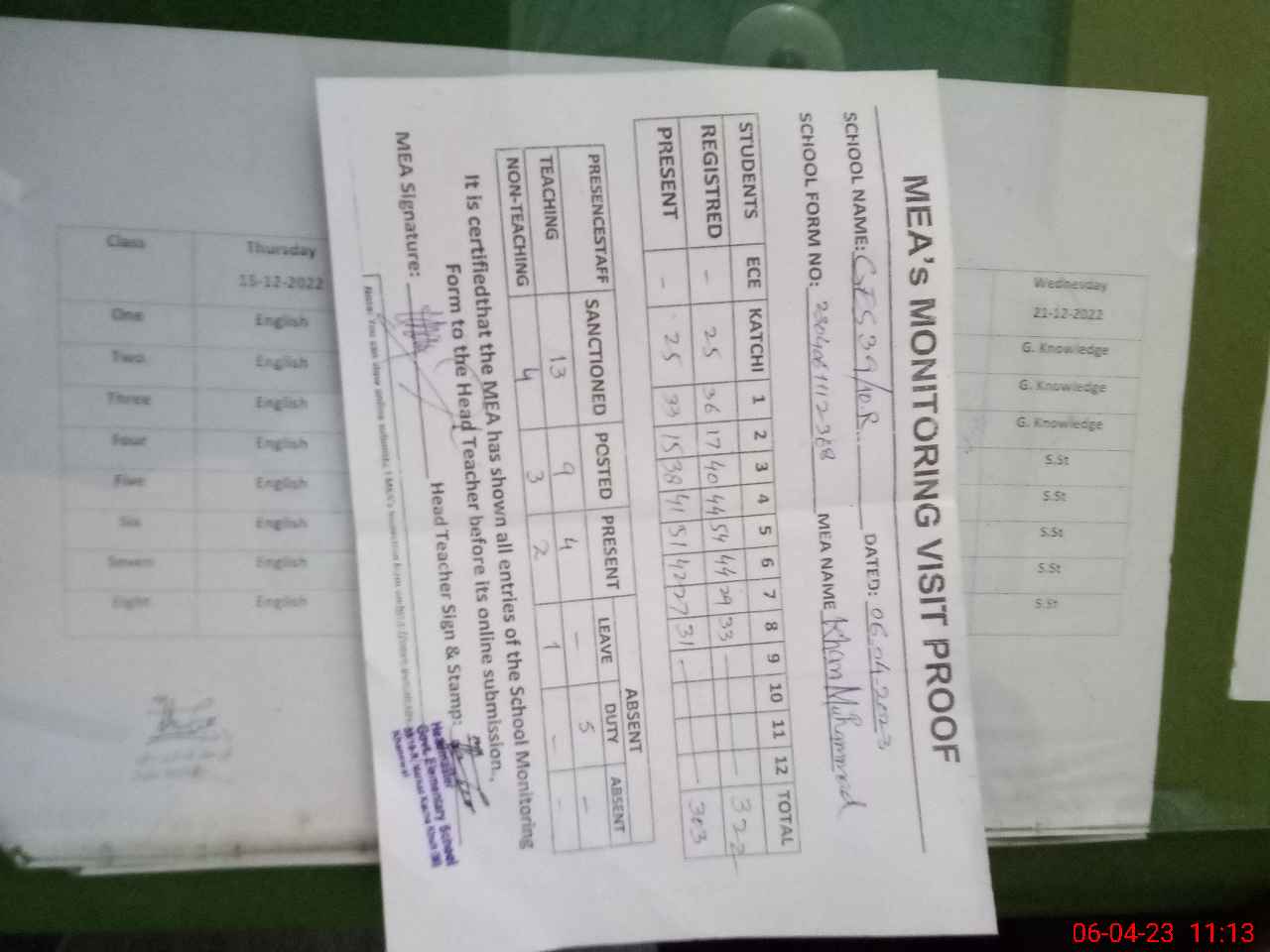 | Attendance Register | Head Teacher | MEA with School | Visit Proof |