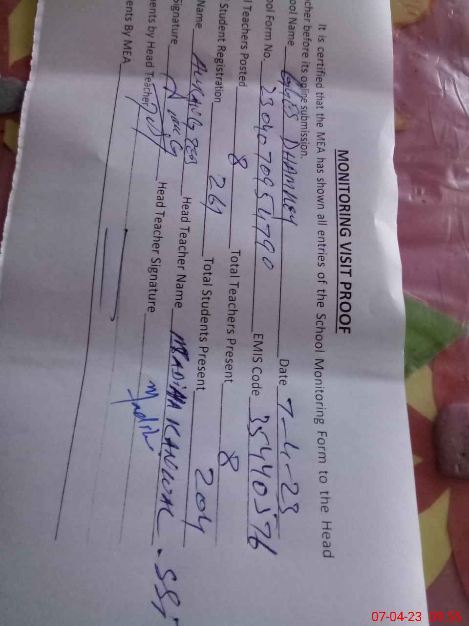 | Attendance Register | Head Teacher | MEA with School | Visit Proof |