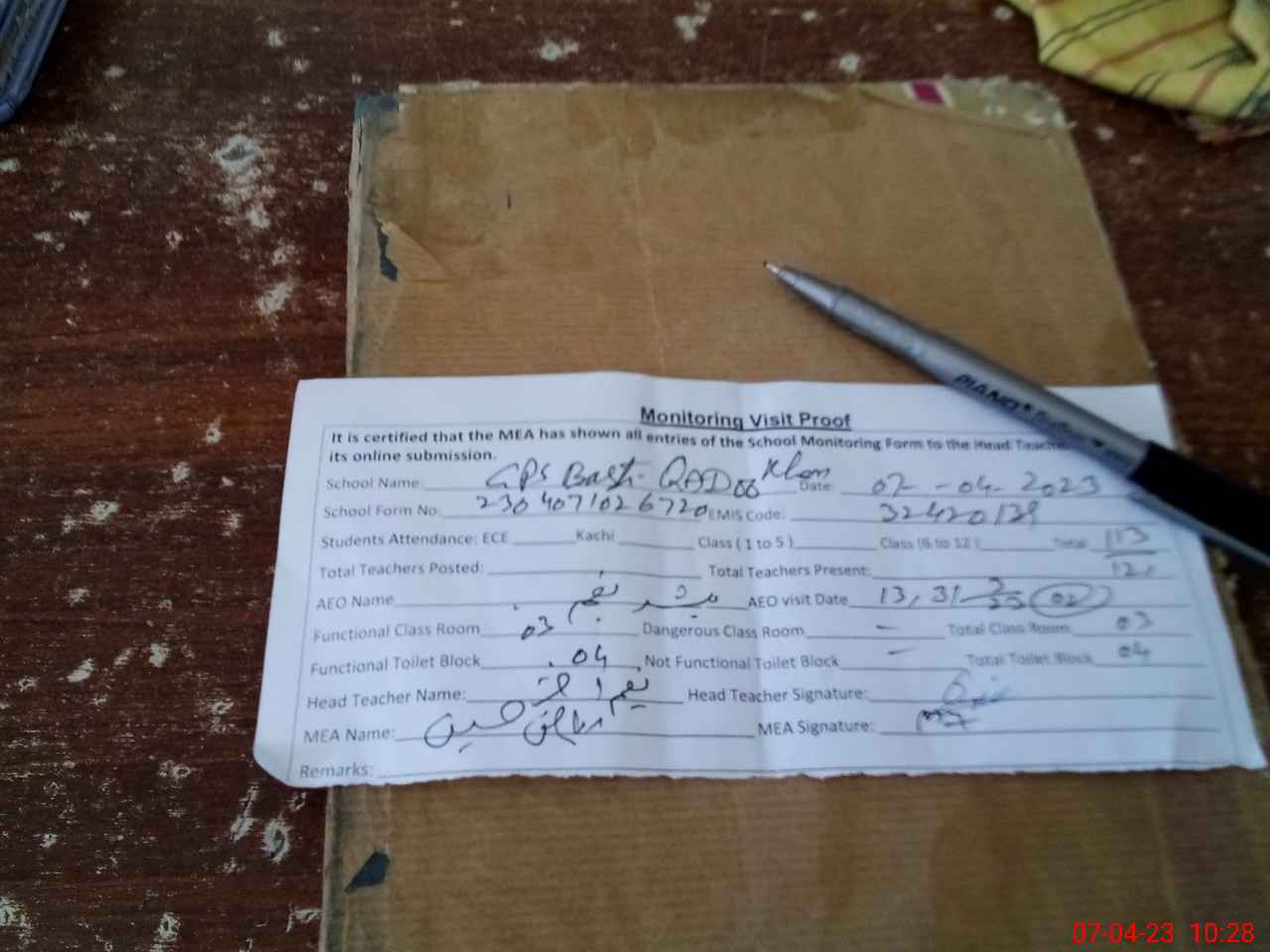 | Attendance Register | Head Teacher | MEA with School | Visit Proof |
