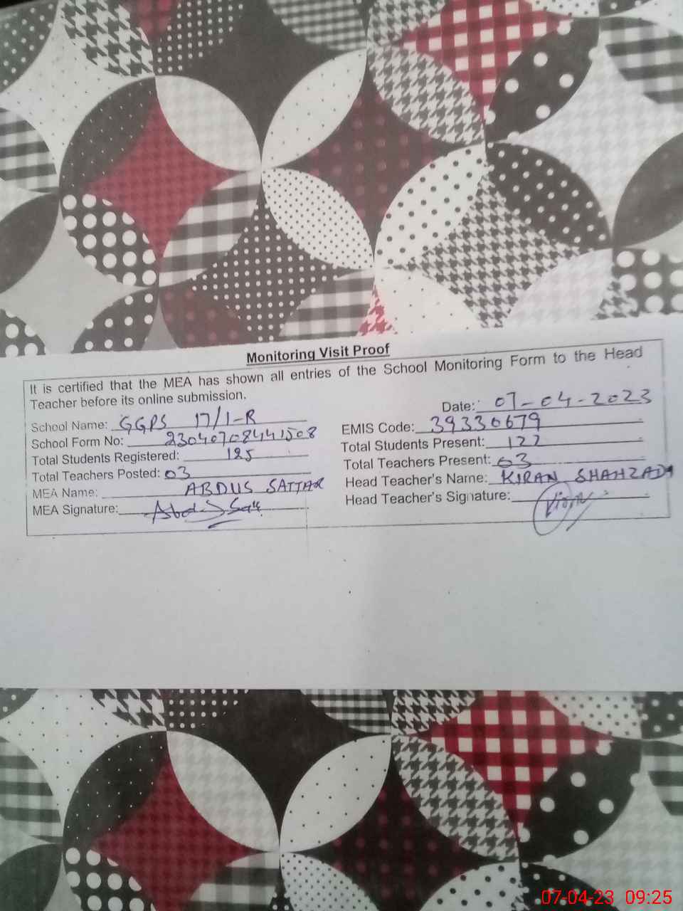 | EMIS Code: 39330679 | Name of School: GGPS CHAK NO. 17/1-R | |||