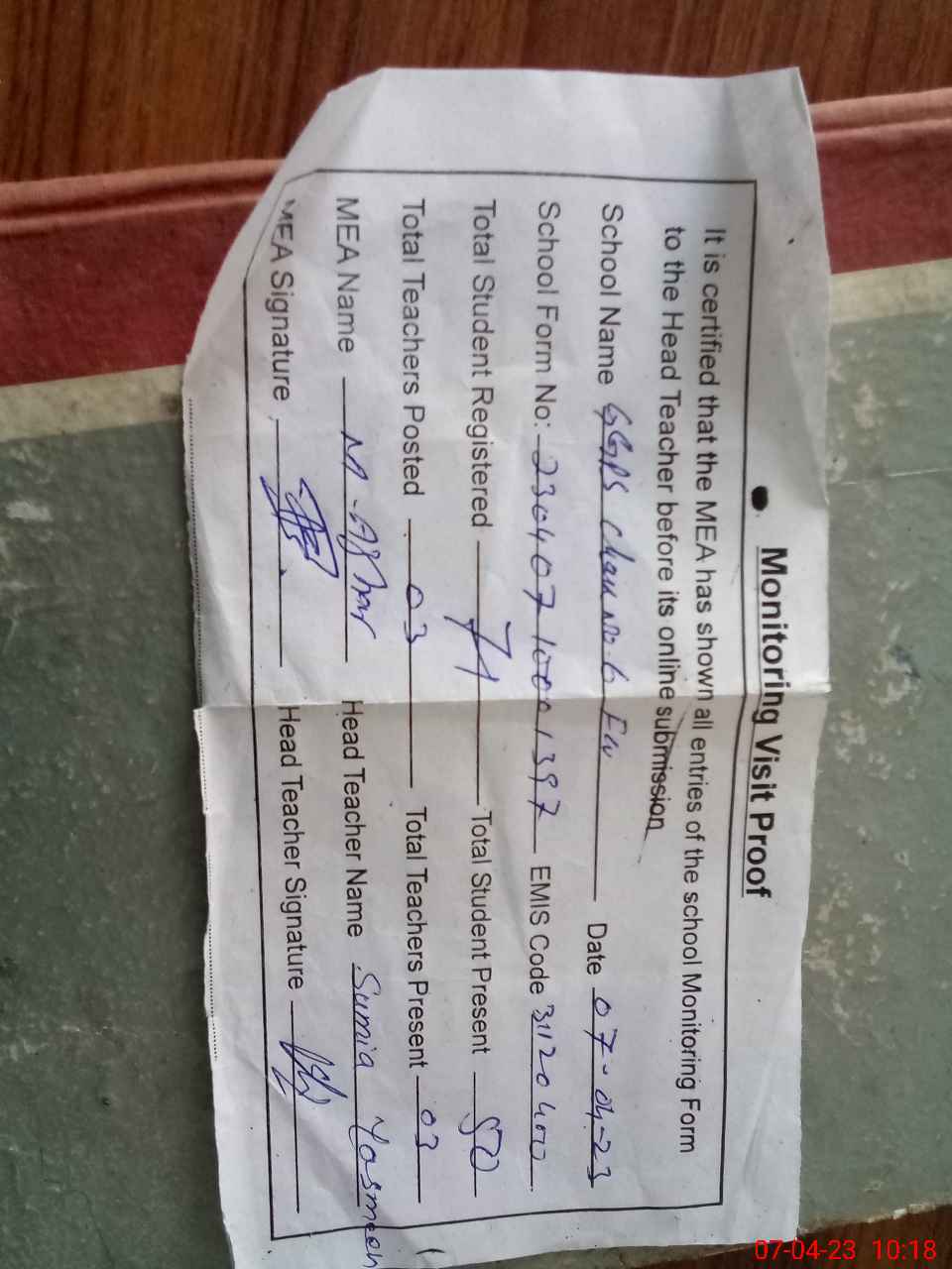 | EMIS Code: 31120400 | Name of School: GGPS CHAK NO.6/FW | |||