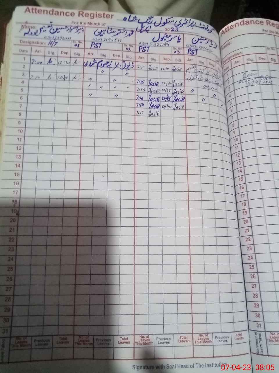 | Name: PI**** IS**** HU**** NA**** Designation: (School Headmaster's/Headmistress's) PST Phone/Cell Number: 03**** |