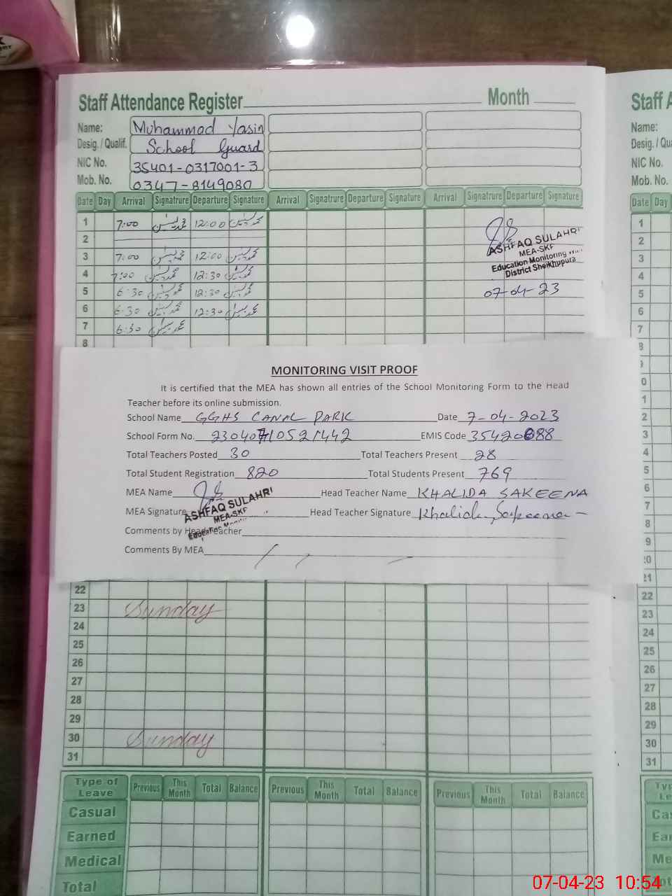 | Attendance Register | Head Teacher | MEA with School | Visit Proof |
