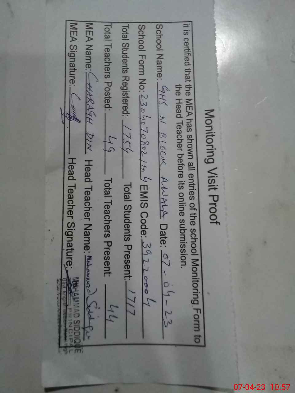 | Attendance Register | Head Teacher | MEA with School | Visit Proof |