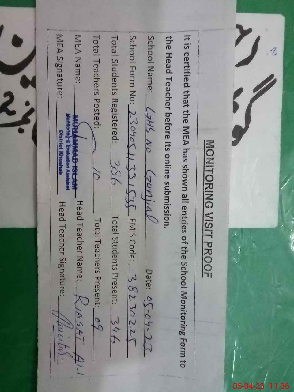| Attendance Register | Head Teacher | MEA with School | Visit Proof |