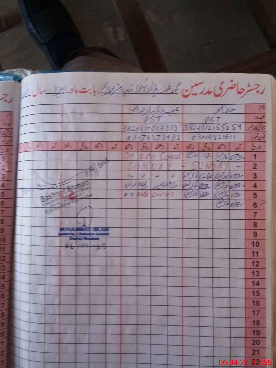 | Name: Ab**** Ja**** Designation: (School Headmaster's/Headmistress's) PST/PTC/JV Phone/Cell Number: 03**** |