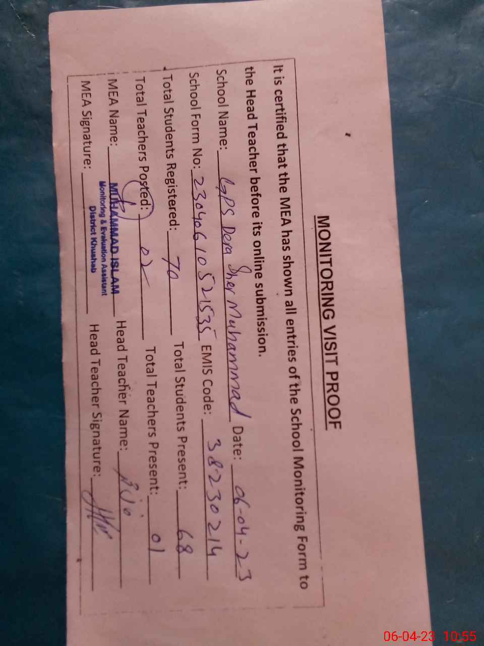 | EMIS Code: 38230214 | Name of School: GPS DERA SHER MUHAMMAD WALA | |||