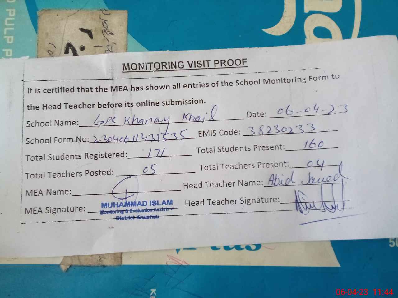 | EMIS Code: 38230233 | Name of School: GPS KHANAY KHAIL | |||