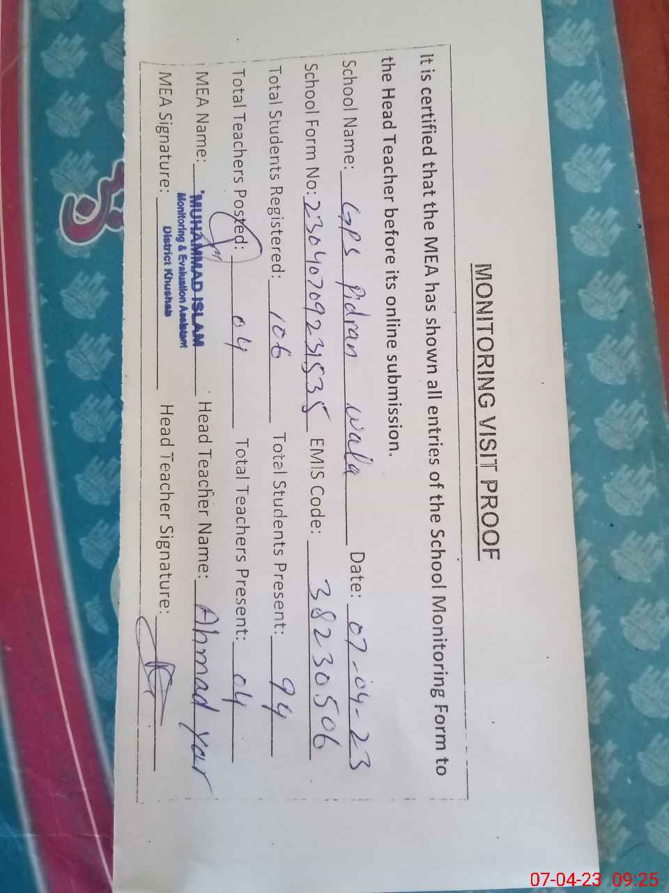 | EMIS Code: 38230506 | Name of School: GPS PIDRAN WALA | |||
