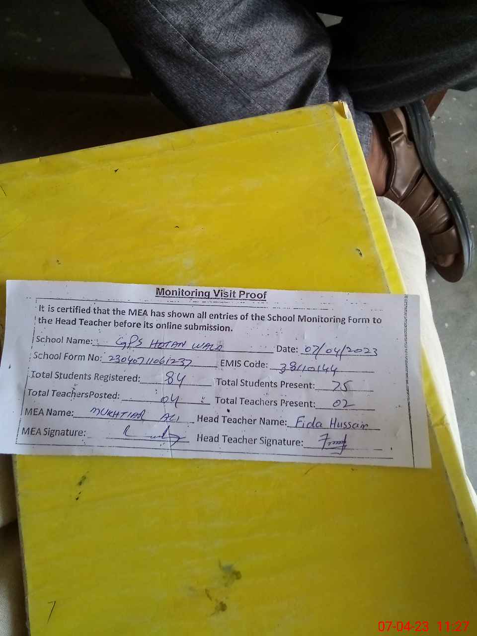 | Attendance Register | Head Teacher | MEA with School | Visit Proof |