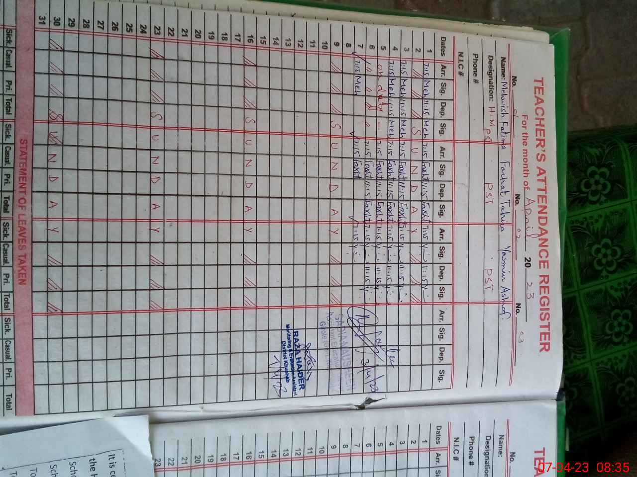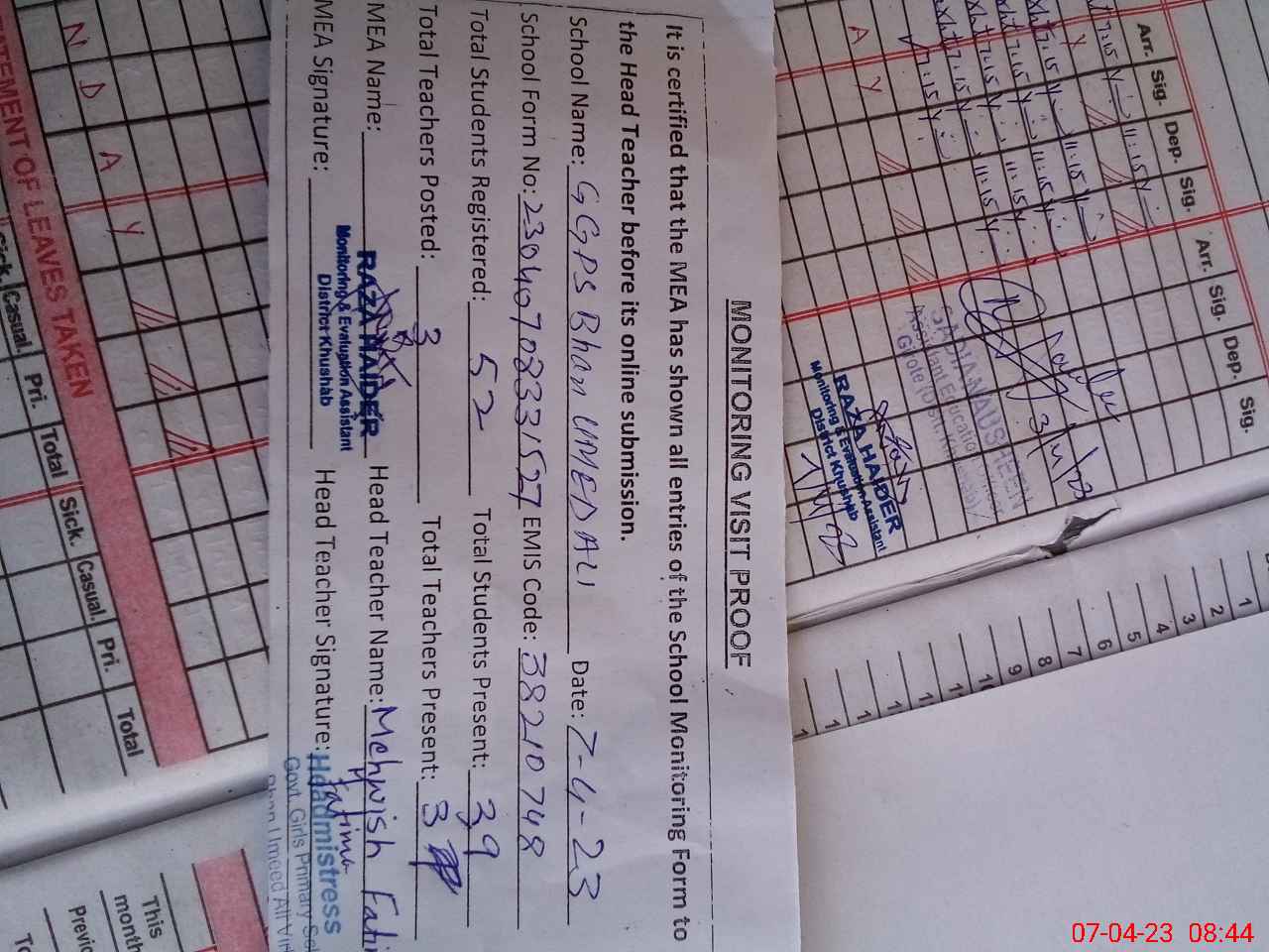 | Attendance Register | Head Teacher | MEA with School | Visit Proof |