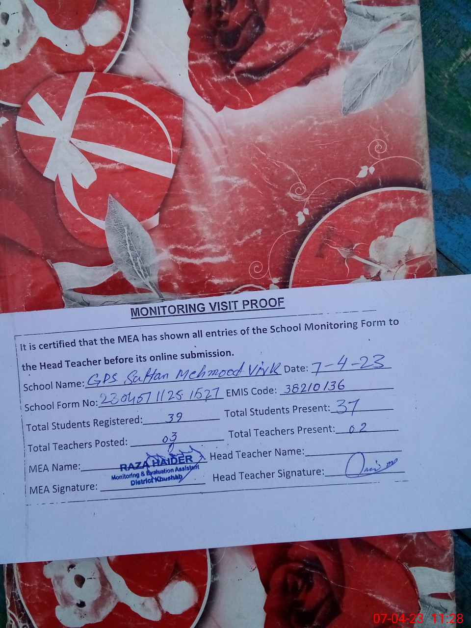 | Attendance Register | Head Teacher | MEA with School | Visit Proof |