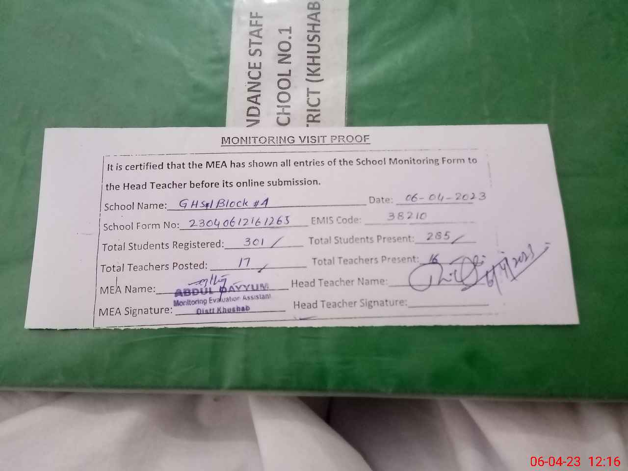| Attendance Register | Head Teacher | MEA with School | Visit Proof |