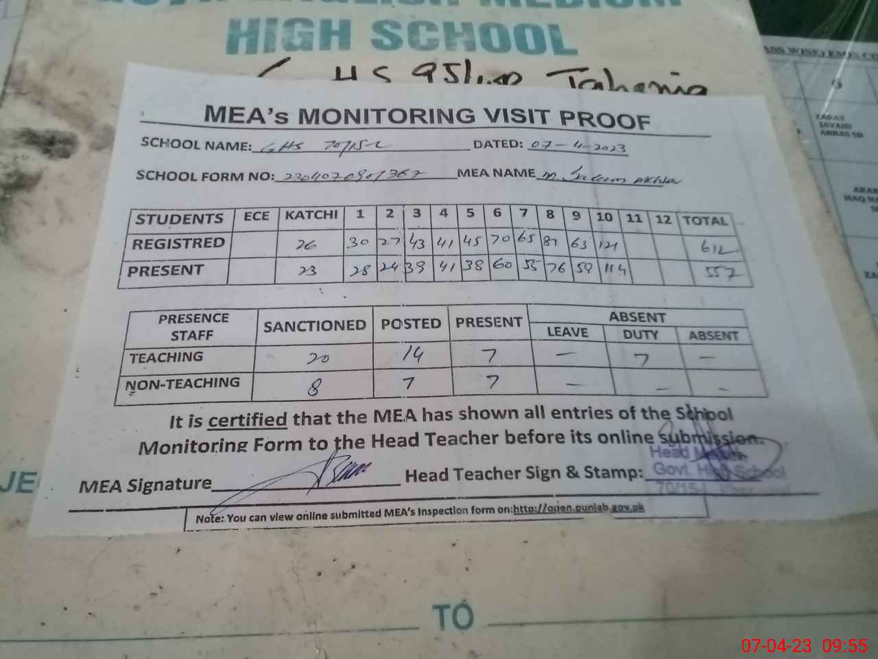 | Attendance Register | Head Teacher | MEA with School | Visit Proof |