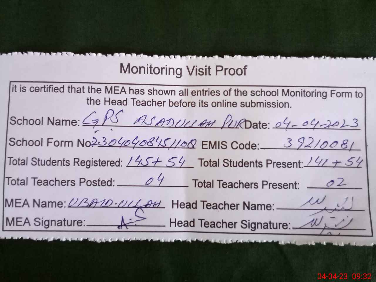 | Attendance Register | Head Teacher | MEA with School | Visit Proof |