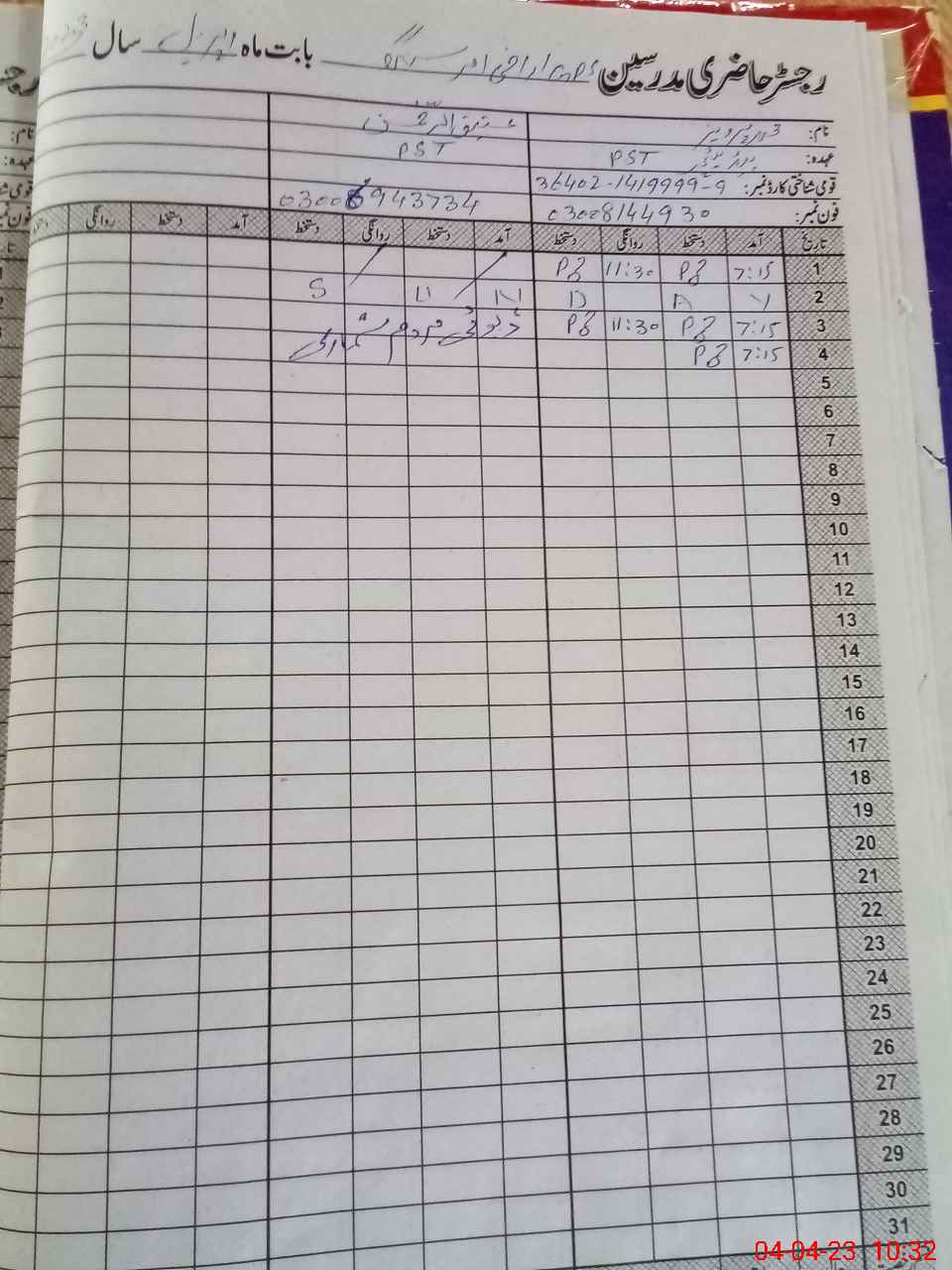 | Name: At**** URe**** Designation: (School Headmaster's/Headmistress's) PTC Phone/Cell Number: 03**** |