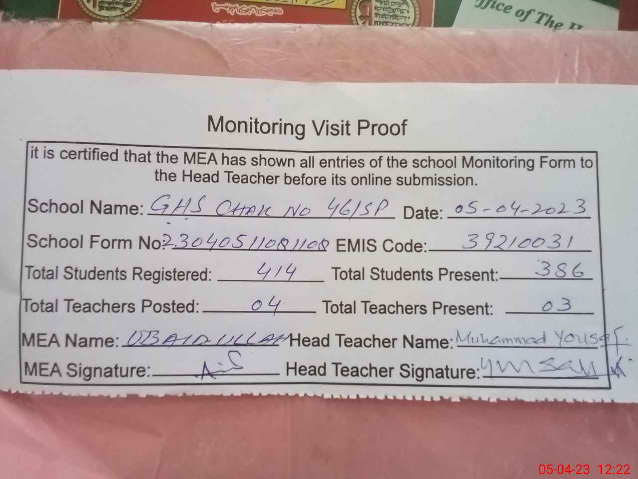 | Attendance Register | Head Teacher | MEA with School | Visit Proof |