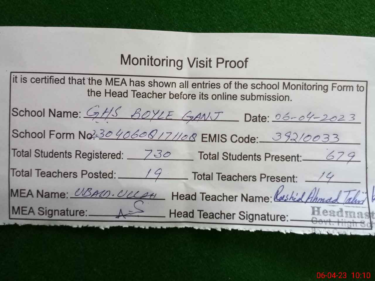 | EMIS Code: 39210033 | Name of School: GHS BOYLE GANJ | |||