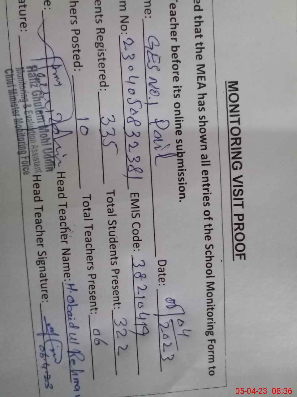 | Name: Ma**** As**** Hu**** Aw**** Designation: (School Headmaster's/Headmistress's) Pst Phone/Cell Number: 03**** |