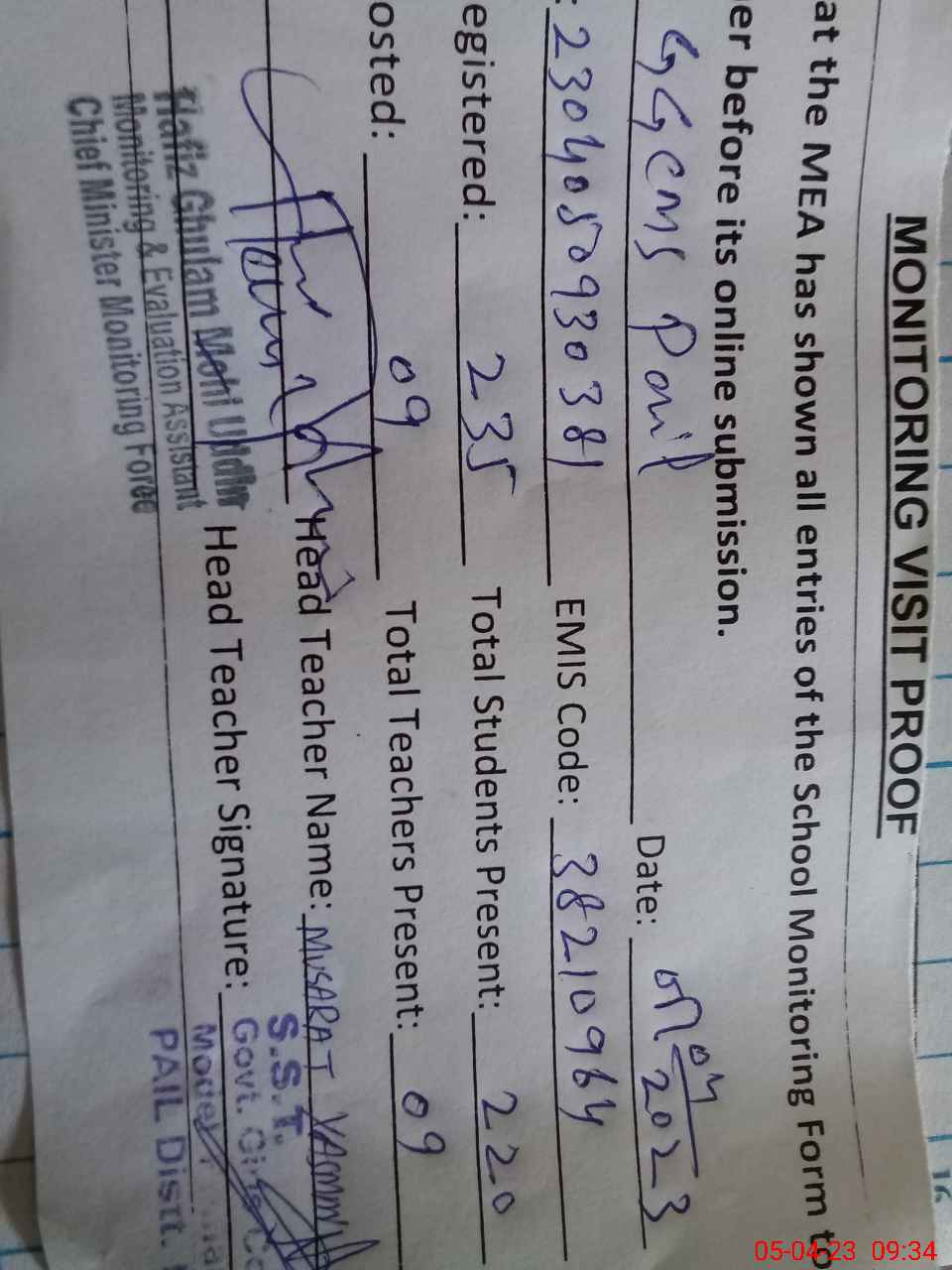 | EMIS Code: 38210964 | Name of School: GGCMS PAIL | |||