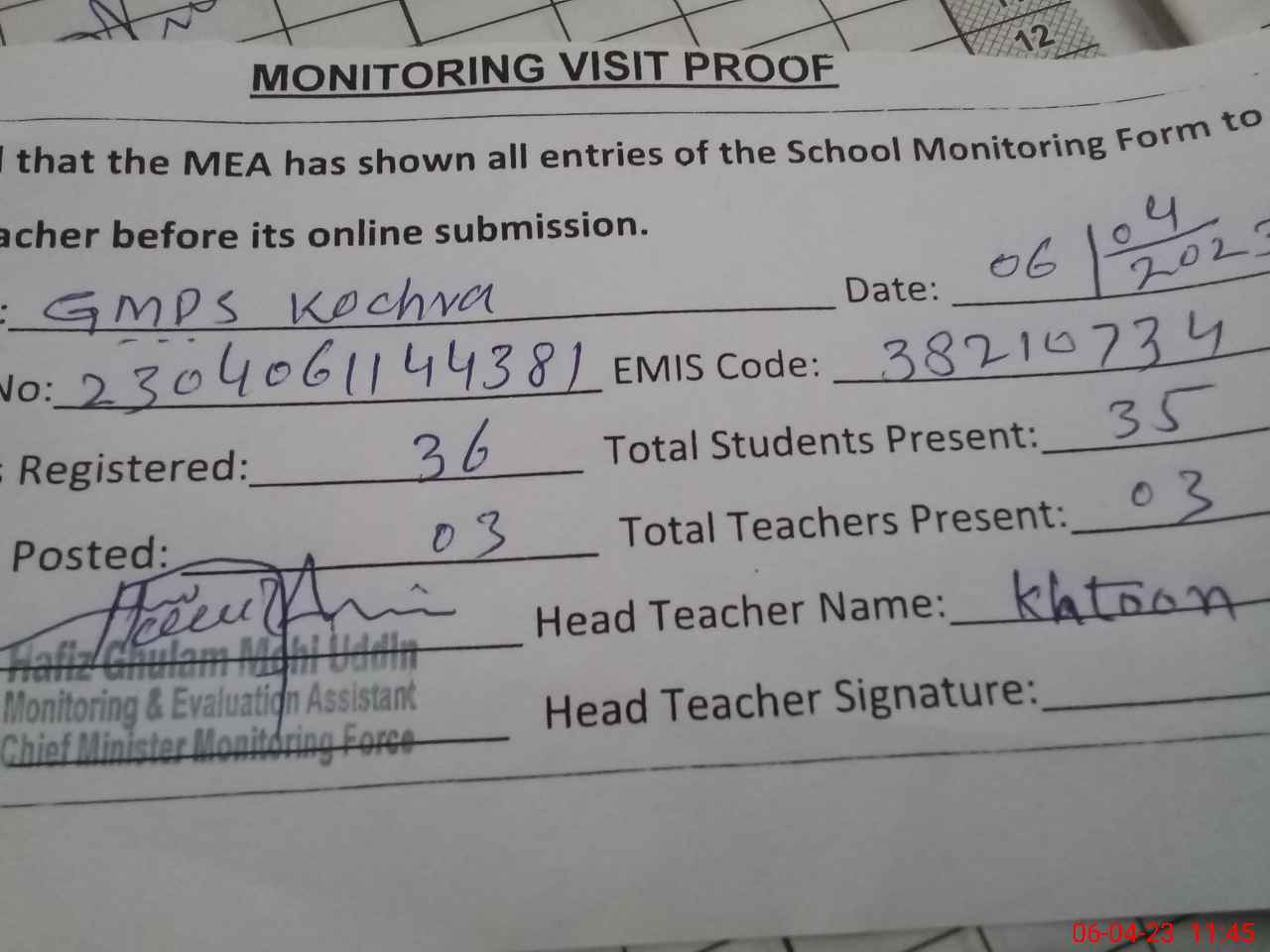 | Attendance Register | Head Teacher | MEA with School | Visit Proof |