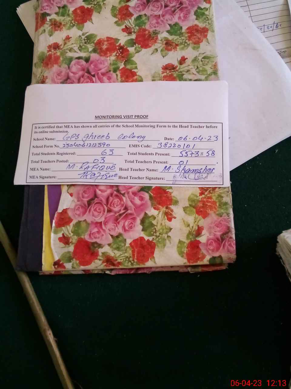 | Attendance Register | Head Teacher | MEA with School | Visit Proof |