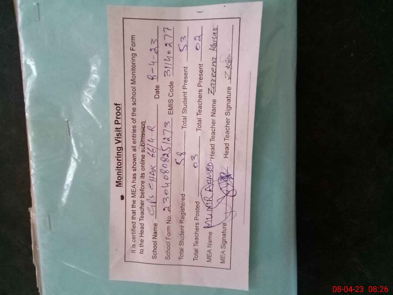 | Attendance Register | Head Teacher | MEA with School | Visit Proof |