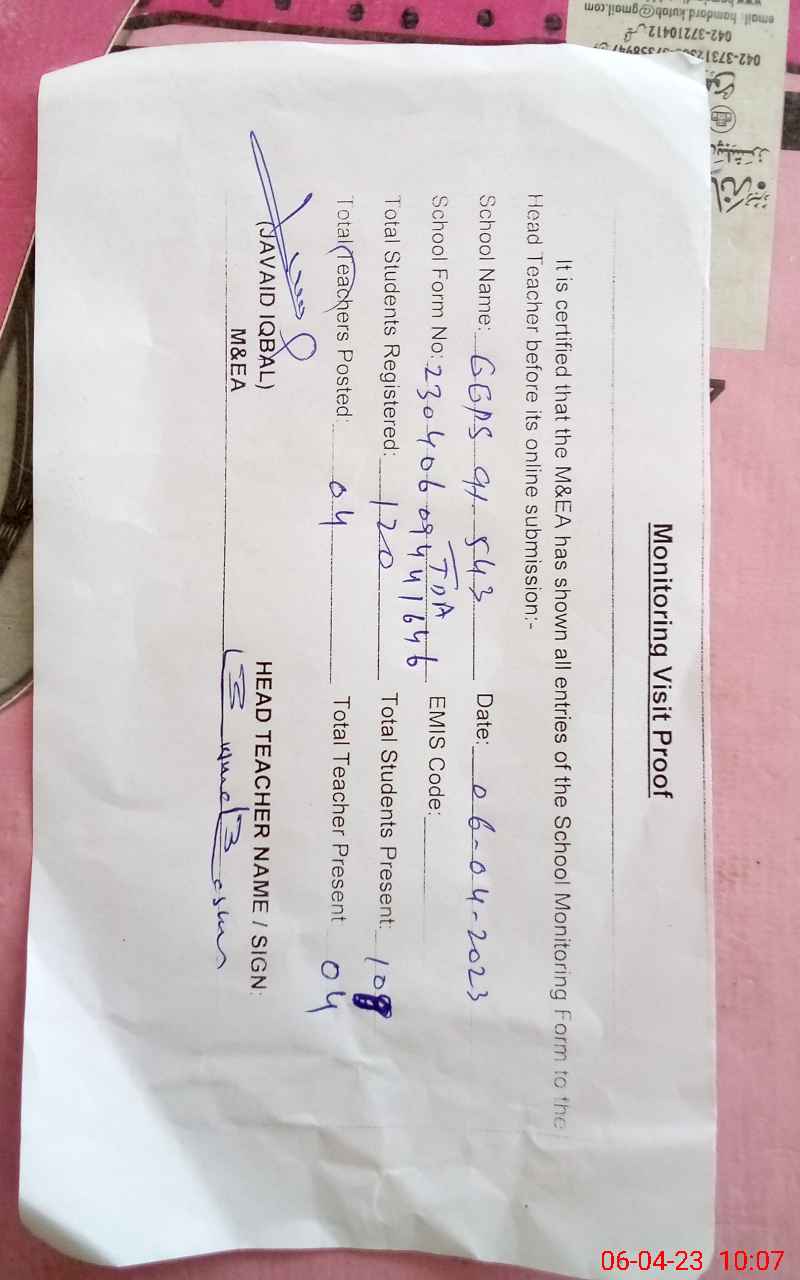| EMIS Code: 32320438 | Name of School: GGPS CHAK NO. 543 TDA | |||