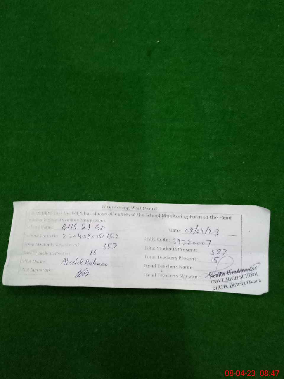 | Attendance Register | Head Teacher | MEA with School | Visit Proof |
