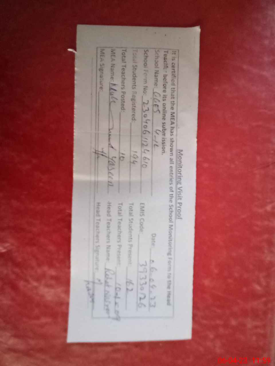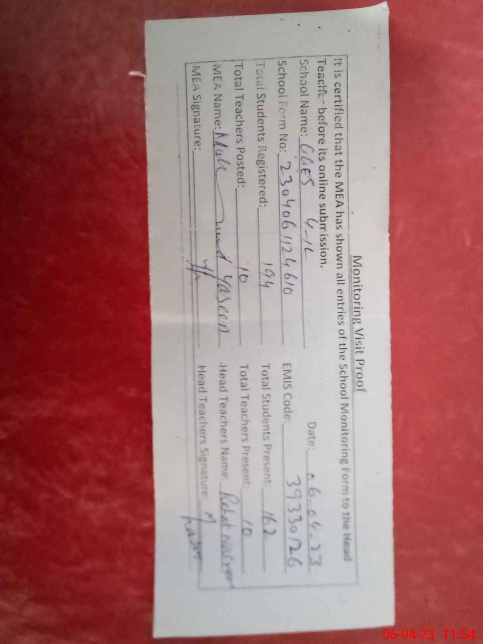 | Attendance Register | Head Teacher | MEA with School | Visit Proof |