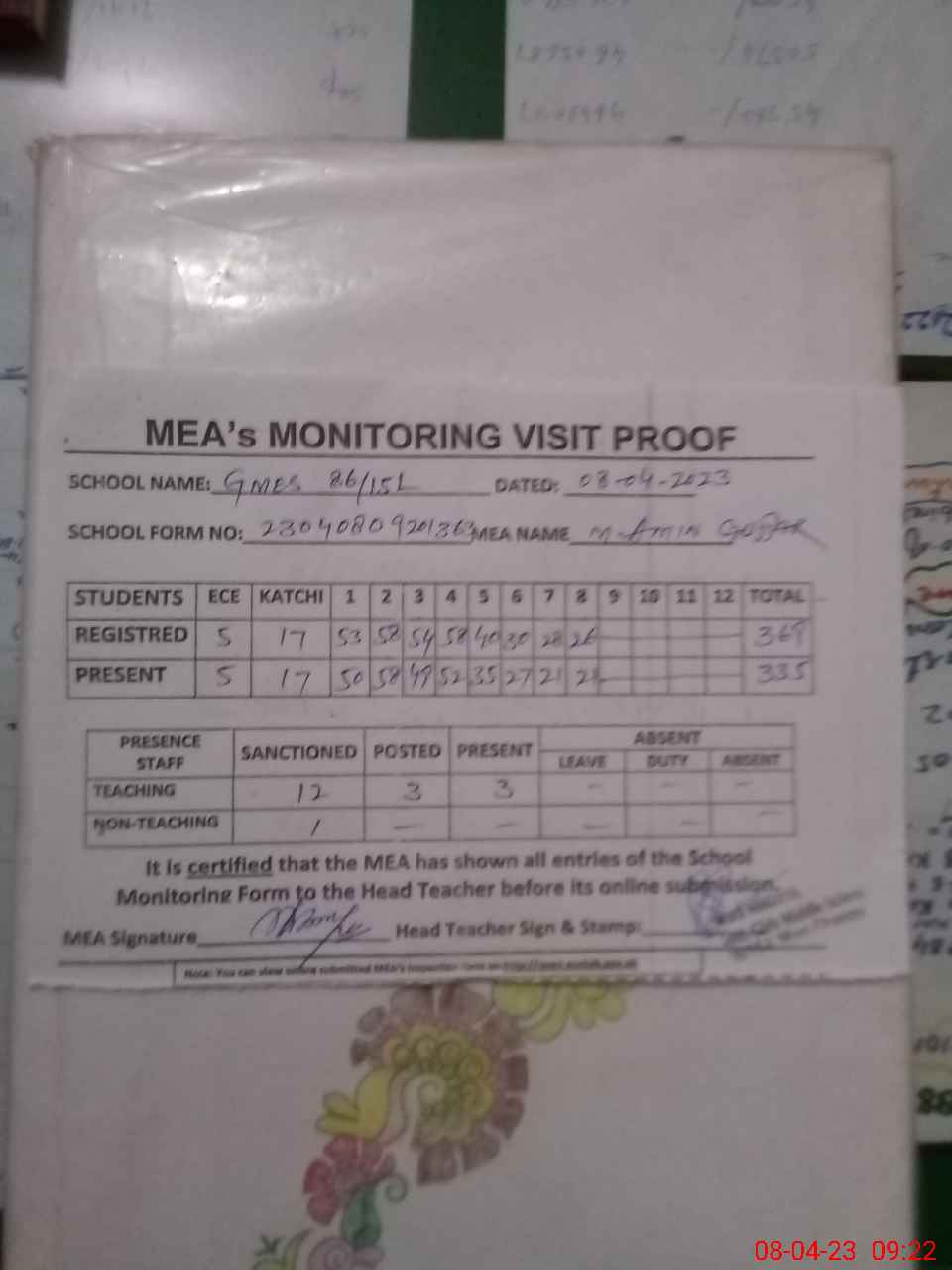 | Attendance Register | Head Teacher | MEA with School | Visit Proof |