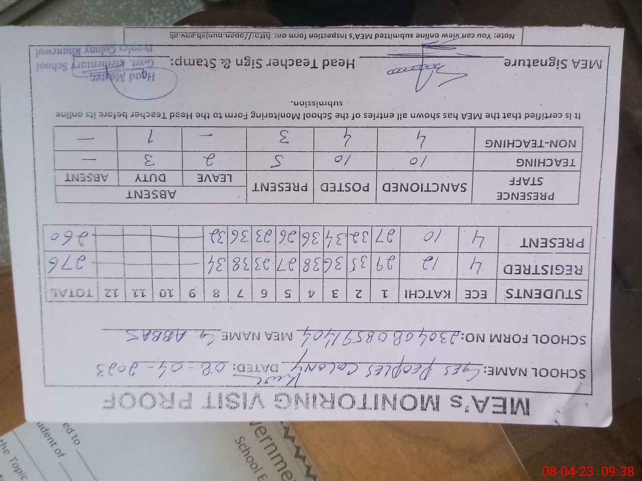 | Attendance Register | Head Teacher | MEA with School | Visit Proof |