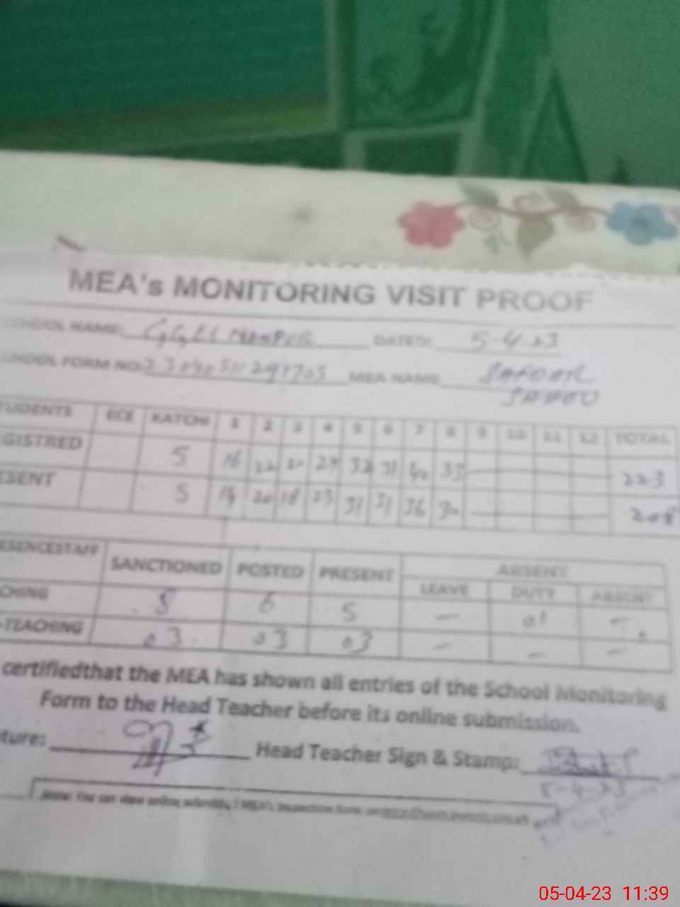 | Attendance Register | Head Teacher | MEA with School | Visit Proof |