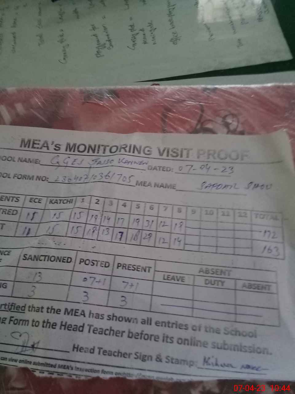 | Attendance Register | Head Teacher | MEA with School | Visit Proof |