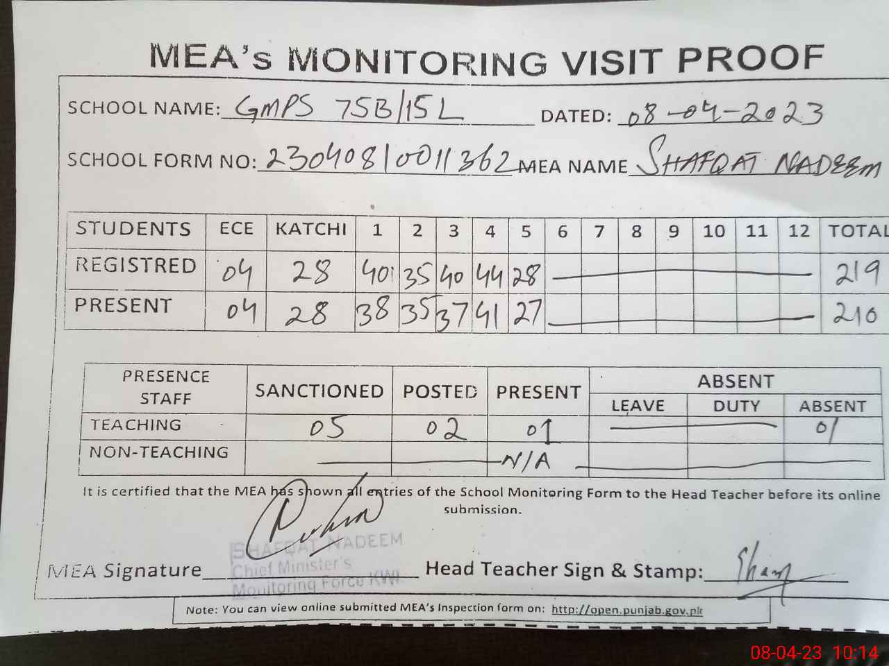 | Attendance Register | Head Teacher | MEA with School | Visit Proof |