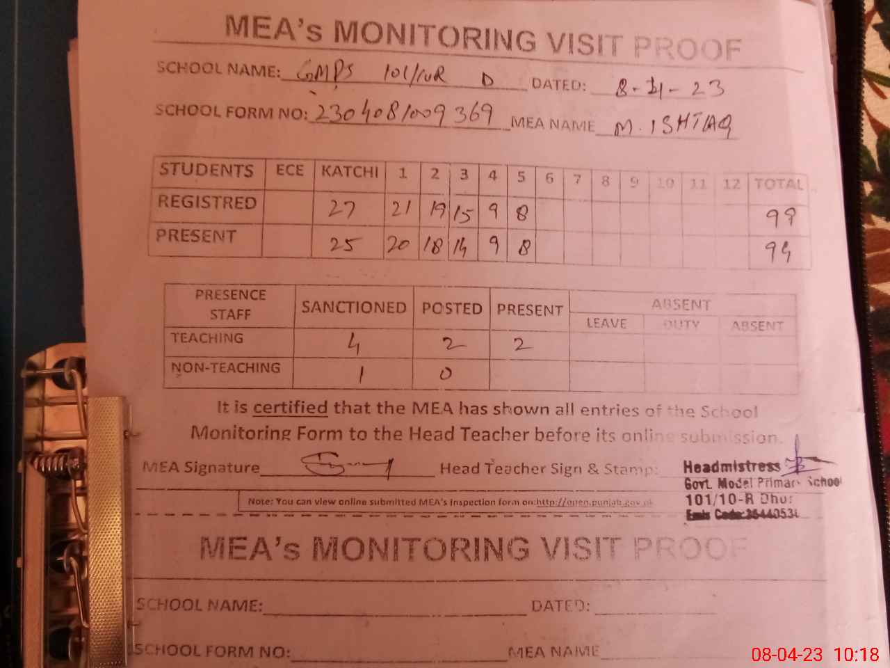 | Attendance Register | Head Teacher | MEA with School | Visit Proof |