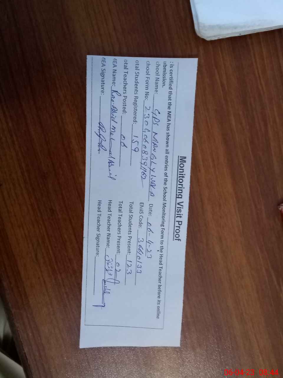 | Attendance Register | Head Teacher | MEA with School | Visit Proof |