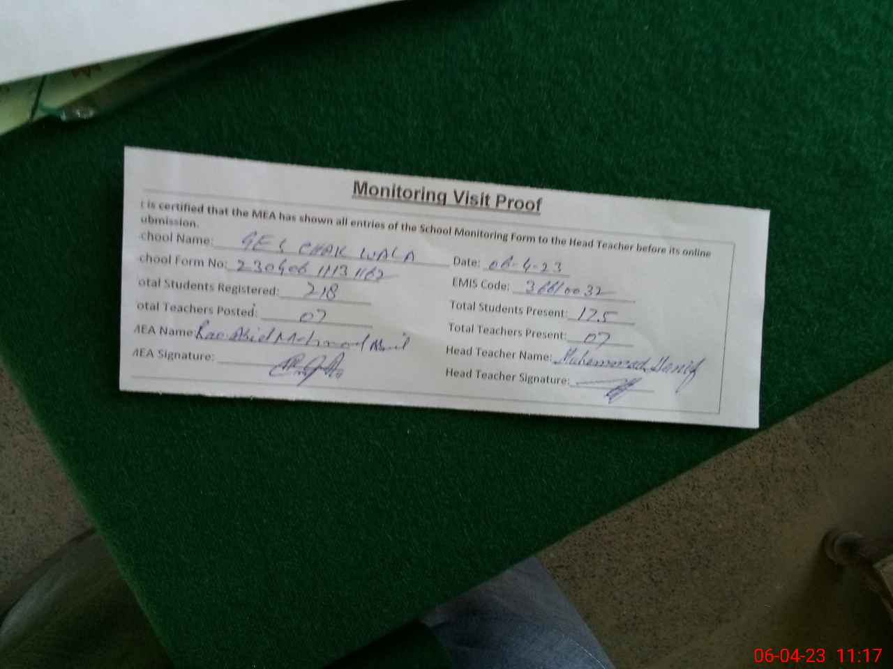 | Attendance Register | Head Teacher | MEA with School | Visit Proof |