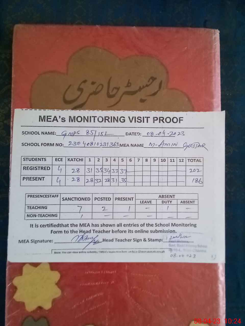 | Attendance Register | Head Teacher | MEA with School | Visit Proof |