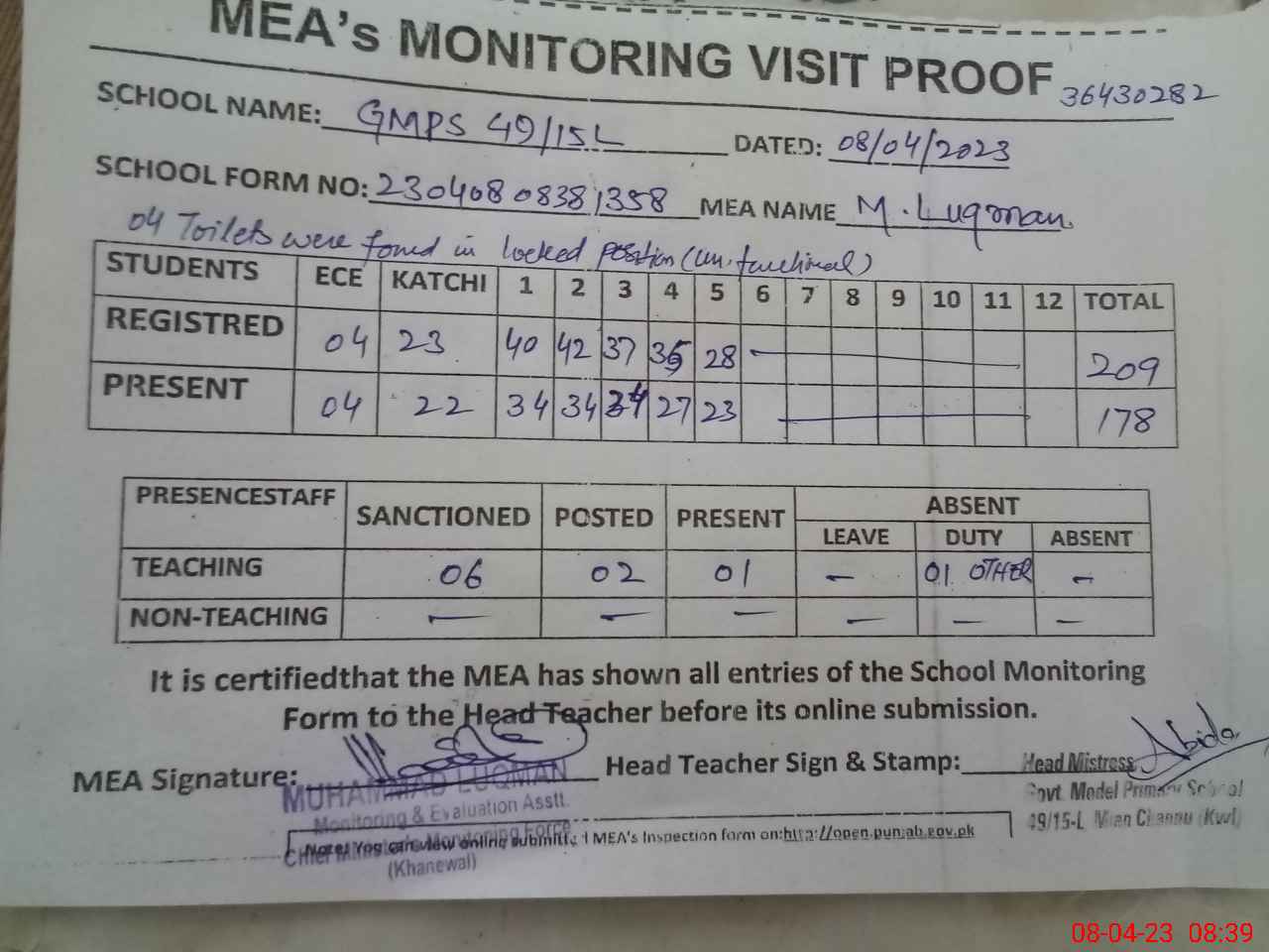 | Attendance Register | Head Teacher | MEA with School | Visit Proof |