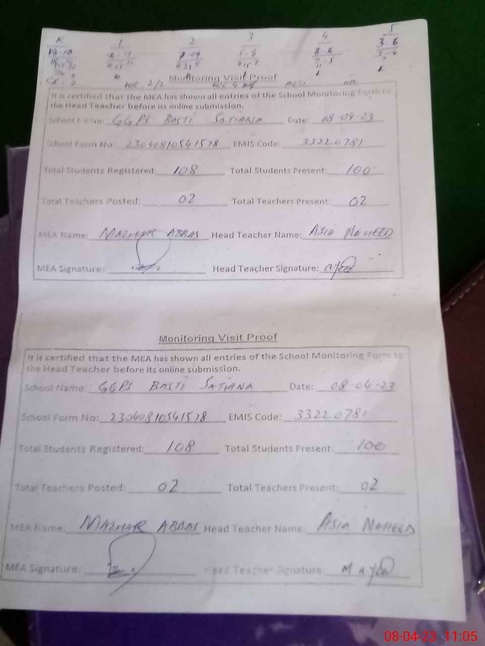 | Attendance Register | Head Teacher | MEA with School | Visit Proof |